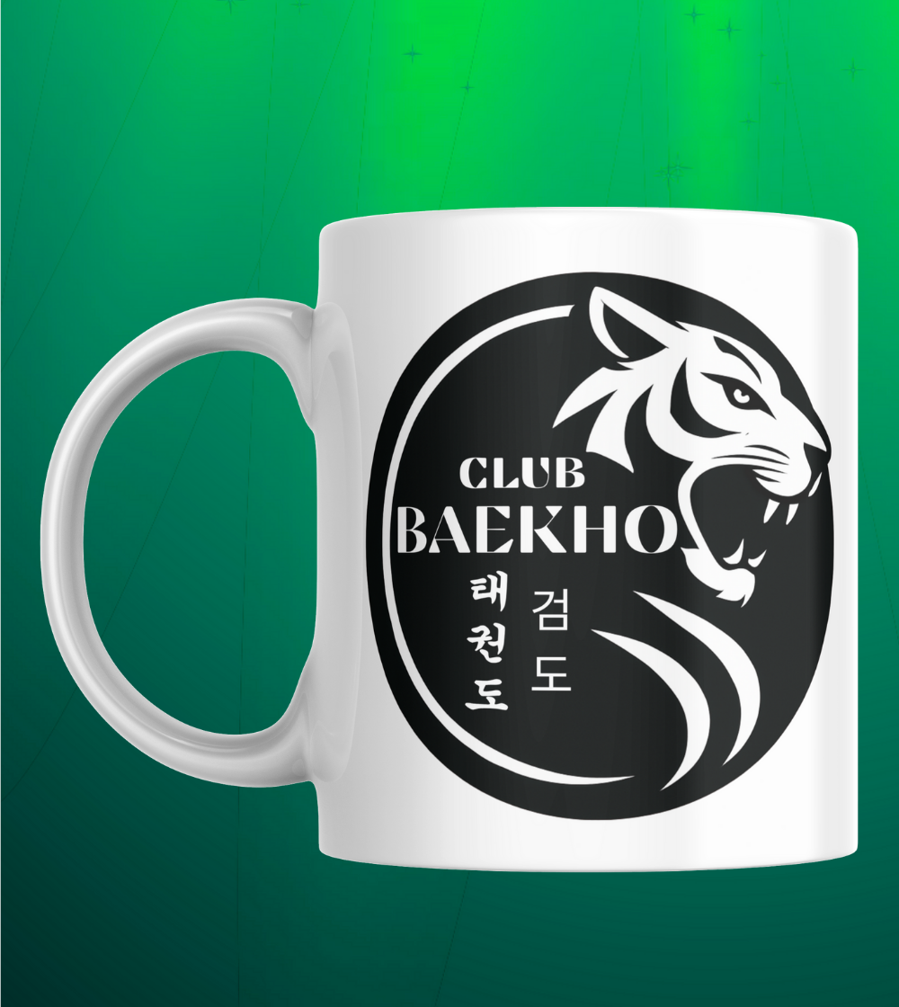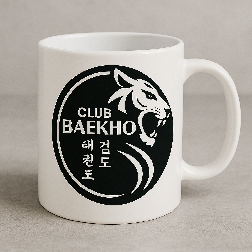Comienza tu día con la fuerza y disciplina del tigre blanco. Esta elegante taza de cerámica blanca presenta el imponente logo del Club Baekho, símbolo de valentía, precisión y arte marcial. Ideal para practicantes de Taekwondo y Kumdo o para quienes valoran el espíritu guerrero, su diseño minimalista y poderoso no pasa desapercibido. Perfecta para café, té o infusiones, esta taza no solo sostiene tu bebida… sostiene tu propósito.